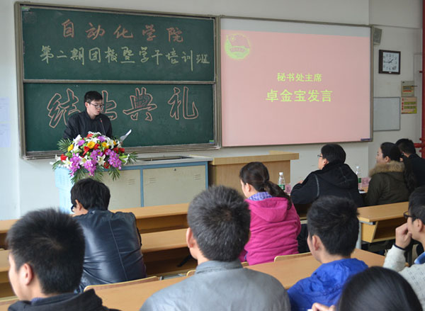 秘书处秘书长卓金宝同学总结了本期团校培训情况,并通过PPT与全体学员一起回顾了整个培训过程。本期团校培训共有102名学生干部参加,95人顺利结业,其中包括优秀学员15人。赵梓竹老师宣读优秀学员名单,并由各年级辅导员颁发荣誉证书。随后,优秀学员代表杨敏同学上台发言,他总结了自己在各次培训中的收获和不足,并决心对自身严格要求,做一名认真负责的优秀学生干部。