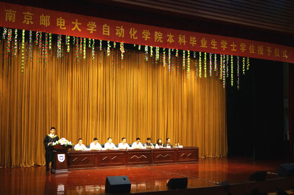 09级毕业生代表张冰同学满怀激情的回忆了在南邮这4年的点点滴滴,他感恩学院老师的谆谆教诲与无私付出,期盼着与同学们十年二十年后的相聚。“感恩母校”道出了全体毕业生的心声,“不忘师恩”是毕业生们的承诺。随后,毕业生代表将一块写着“厚德载物”的匾额赠送给学院,寄托了全体毕业生对学院的深深眷恋和拳拳赤子之心。