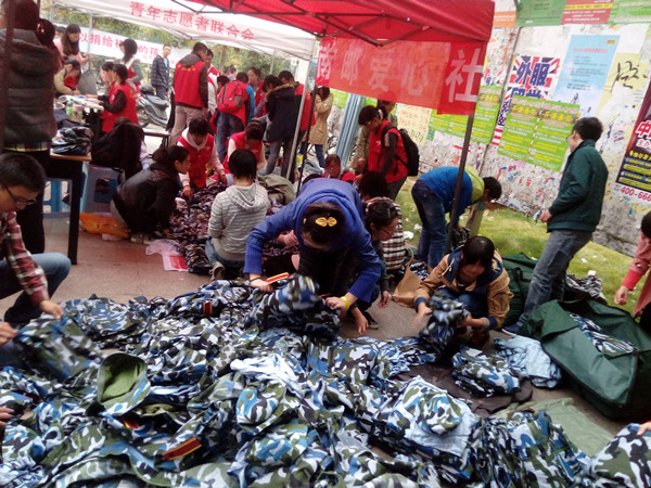 8日下午新生军训闭幕式一结束,爱心社的社员们九早早的守候在回收军服的帐篷下,虽然天气渐凉却阻挡不了同学们的饱满热情,他们热情地向过往的新生宣传这个活动,在得知爱心社利用军服变卖的善款已经为尧化门小学建立了一个图书角,之后也将继续投入在义工点的建设中时,有一位同学当场脱下军服送到了在场的爱心社社员手中,让人感动。即便是军训刚结束,爱心社大一干事们仍旧不辞辛劳,积极的在现场整理衣服或是回宿舍鼓动室友一起为爱心出一份力。整个活动中,同学们配合默契,各司其职,团结协作,本着自愿原则,让回收军服的工作井然有序地进行着。