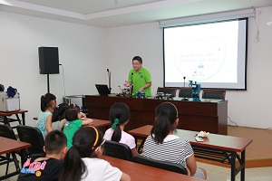 机器人创新实践基地主席的崔轩宇同学担任本次活动的主讲。崔轩宇同学用精美的PPT生动地为小朋友讲解了机器人的构造和原理,通过视频放映的形式告诉了孩子们机器人到底是什么,讲解了机器人的发展历史和发明构成。之后,他又为小朋友们演示了带来的机器人,小朋友们见识到了不同种类、不同功能的机器人,在欢乐的气氛中领略机器人的魅力,感受科技、知识的力量。最后,社区小朋友们在志愿者的讲解下与仿真机器人、救援机器人、机器狗等实体进行了零距离互动。本次活动在小朋友们的欢声笑语中落下帷幕。