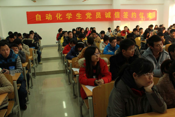 临近期末,为了在全院营造诚信考试氛围,树立良好考风,充分发挥学生党员的先锋模范带头作用,麻豆av 在本月初启动了学生党员学风考风示范月活动,并于12月14日下午在教四409举行了系列活动之一学生党员诚信签约仪式。学院党委副书记高志华老师、党委组织员陈素兰老师、分团委书记叶晓勤老师和2009级辅导员赵梓竹老师以及全体研究生和本科生学生党员参加了签约仪式。