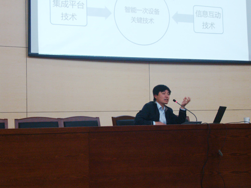 会谈后,唐总为我校师生作了“智能一次设备与电气设备状态在线监测”的学术报告。报告会上,唐总从技术特点、功能与体系结构三个方面介绍了智能电网变电站的建设要求,指出智能电网建设要求一次设备智能化。接着从概念、机构和技术基础等几个方面详细介绍了智能一次设备在智能电网中的作用。唐总还就电气设备在线监测系统的组成与分类、电气设备检修技术的发展等几个方面,介绍了电气设备在线监测面临着的发展机遇。