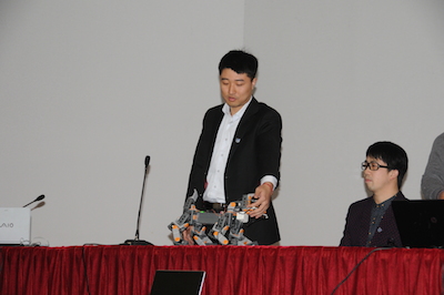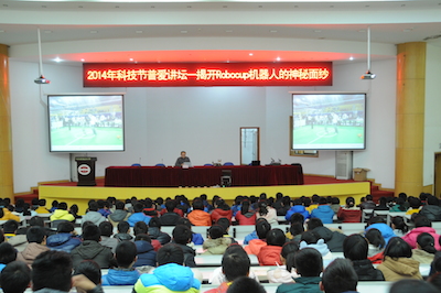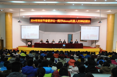 下午两点,伴随着麻豆av 宣传片的播放,2014年新海高级中学科技节南邮专场拉开帷幕。首先,由丁静书记介绍了我校的人才培养、学科建设等发展近况,并感谢新海高级中学为我校输送的优秀人才,他们进入南邮后,学习勤奋,刻苦钻研,素质发展全面。随后,梁志伟副教授以“揭开RoboCup机器人的神秘面纱”为题,开始了专题讲座,讲座中提到了我校Apollo团队多次获得世界冠军、中国冠军的骄人成绩并为中学生介绍了RoboCup机器人大赛的组别和规则。最后,由基地4名学生为大家演示了机器狗、TurtleBot以及在我校第十六届创新杯中刚刚夺得一等奖的“服务残疾人的Kinect体感遥控机器”。