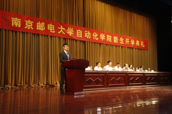 会议开始,全体起立奏唱国歌,仪式完毕后由副校长王国平致辞。他从青年人的价值观入手,提醒广大新生首先要感恩父母、老师,其次要学会自己学习、规划自我,迈好人生第一步。他指出:“信达天下,自强不息”是南邮的灵魂,新生们应该努力去感悟大学的真谛,以格物致知为方法,一步步地做到修身、治国、平天下。接着王国平教授又简要地介绍了南邮校史、院系组成等,最后,他希望同学们在大学里不仅要学习知识,还要涵养人格,树立伟大的目标和为中华之崛起而读书的宏伟抱负。