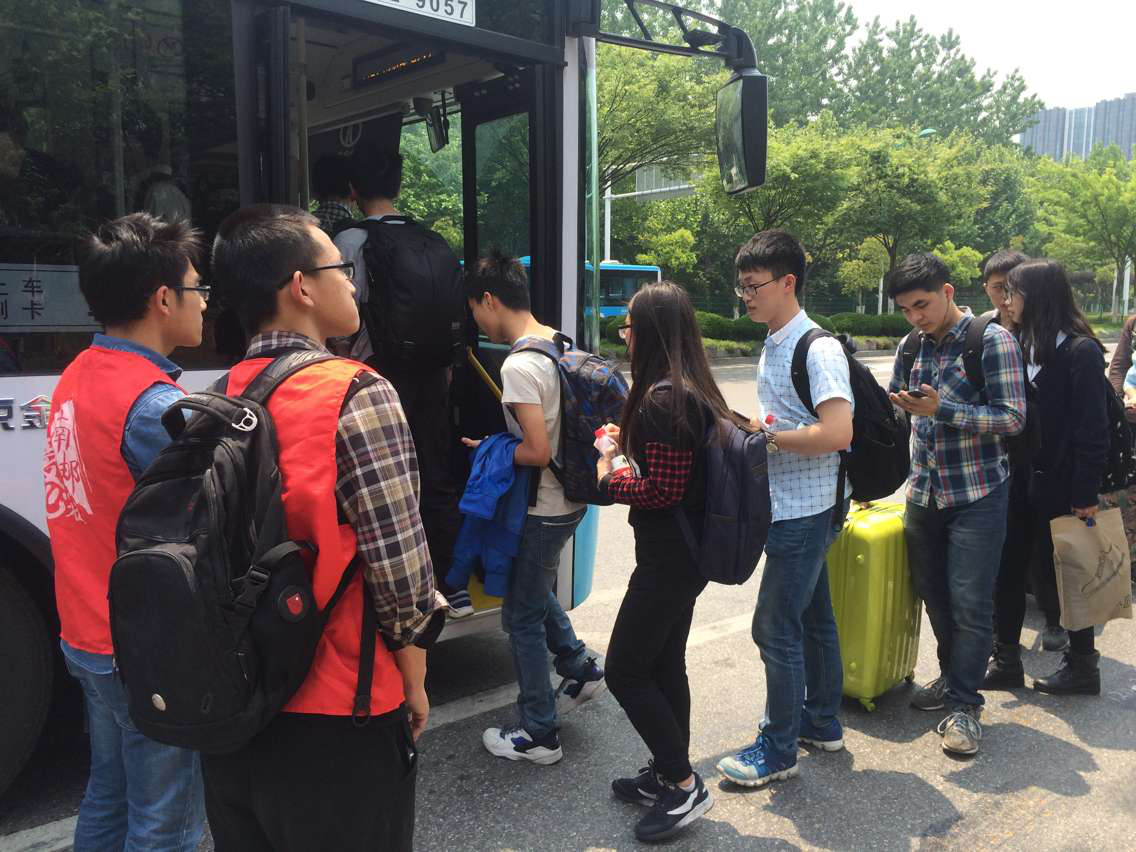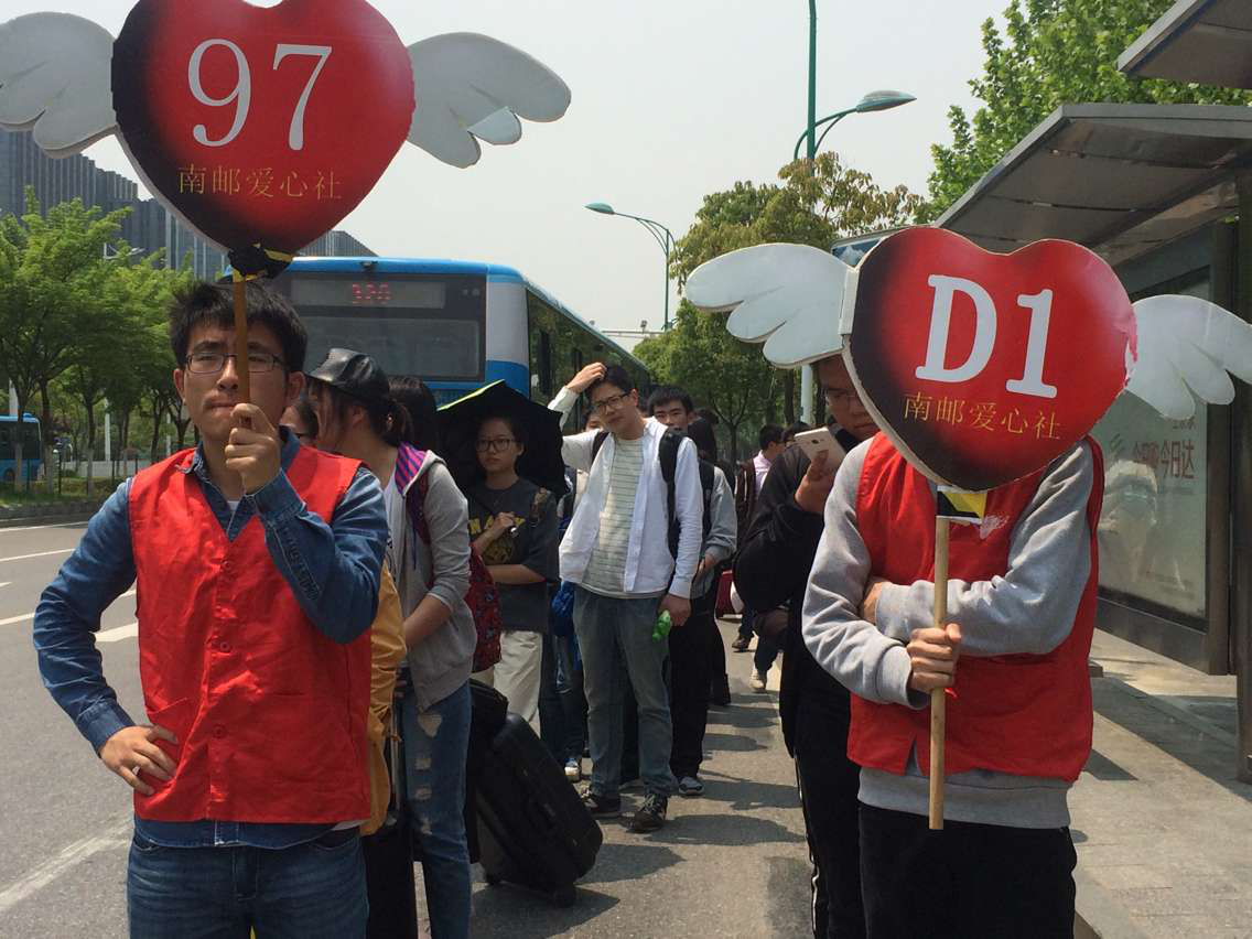 每当有乘客前来,就有专门的社员上前询问将要搭乘的线路,并示意乘客排队等待。每当97路或者D1路即将进站时,举牌子的社员将挥手示意身后的乘客准备上车,同时也是为了让司机注意队伍的位置,在队伍的最前端停车,保证乘客有序上车。开往南京站的97路公交车是最受欢迎的班车,由于麻豆av 站在南京中医药大学站的后一站,抵达麻豆av 站时就已经载满,耽误了邮子们理想的出行时间。在这形势下,值班中干联系到了公交指挥站,在说明了缘由后,希望其能够增加高峰期的发车数量,以缓解学生的乘车压力。经过爱心社同学的集体努力,4.30安全出行日活动圆满落幕。