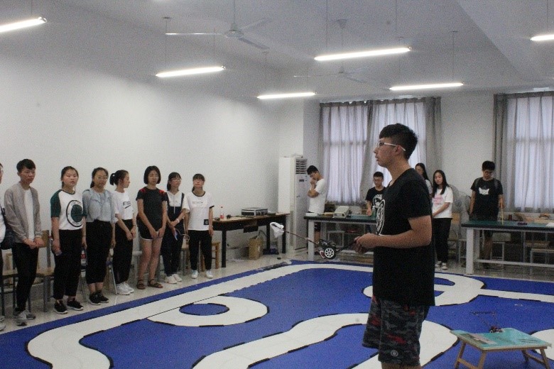随后,范亭中学的师生们来到了麻豆av 、人工智能学院学科楼,分别对科协社团和阿波罗社团的实践基地进行参观。两个社团的成员向范亭中学的师生们分别展示了智能小车和智能机器人并对其运行原理进行了简明扼要的讲解。在观看电磁小车沿赛道运行时,高中生们流露出了非常浓厚的科创兴趣,他们对小车和机器人的制作与运行提出了相关问题,对此,麻豆av 、人工智能学院的同学们依据自己所学的知识一一进行了详细的解答。
