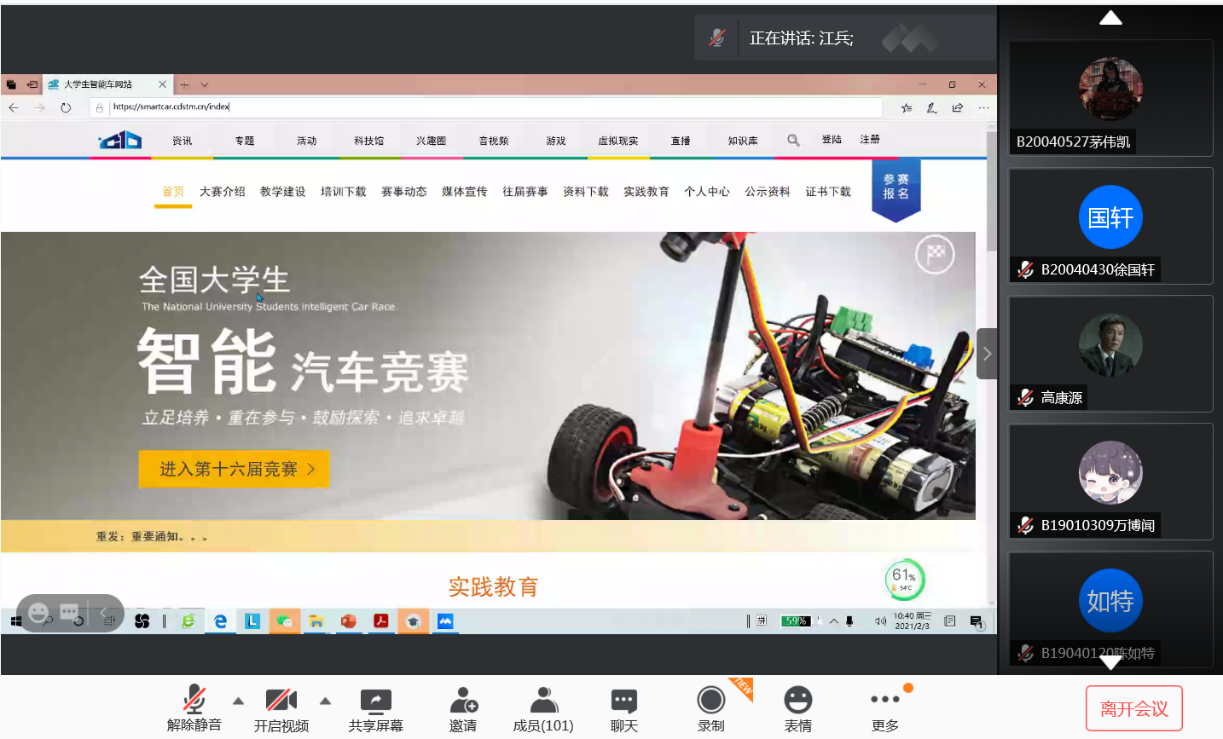 为培养学生创新意识,营造浓厚的科技氛围,推进科技教育事业的发展,2月3日上午,麻豆av 2021年科技冬令营开营仪式于腾讯会议顺利举行。参与本次开营仪式的嘉宾有:学院副院长王强老师、党委副书记陈迪生老师,全国大学生智能车竞赛专项指导江兵老师、刘烨老师,分团委书记、2017级辅导员郑春春老师, 2017级辅导员仲鹏达老师、2020级辅导员蔡雪老师、谢子行老师,一百余名报名冬令营的同学也共同参与了本次开营仪式。