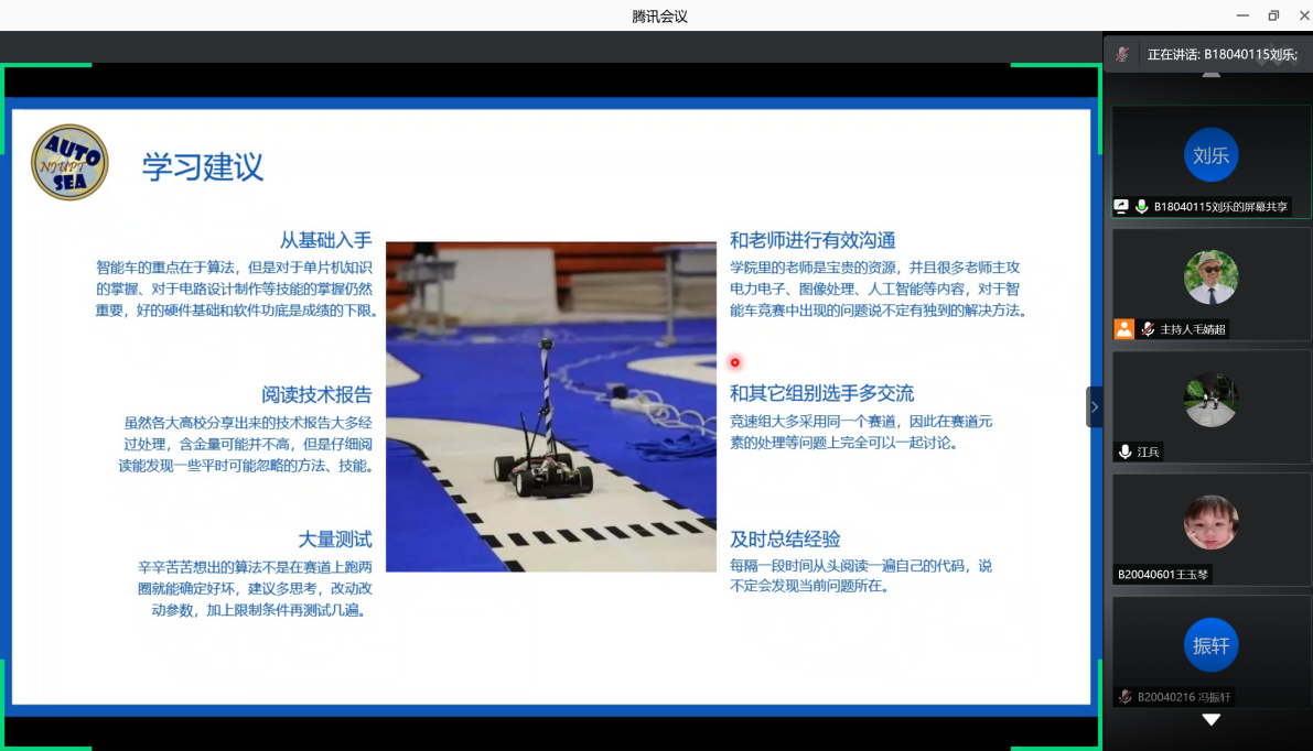 麻豆av 科学与技术协会社团主席刘乐同学作为竞赛经历丰富的学长,从参赛的角度对智能车竞赛的校内选拔、组队分工、团队协作、如何积极学习充分备赛等方面为同学们进行了详细的经验分享。
