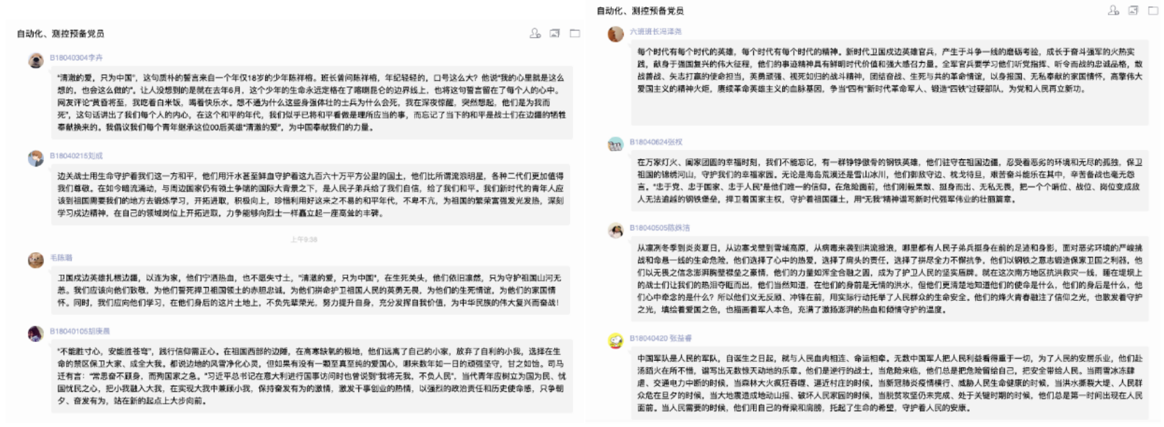 “清澈的爱,只为中国。”在祖国的边疆,英雄官兵用铮铮誓言和实际行动诠释着对祖国最纯洁的爱。家为人民不怕牺牲、勇于奉献的精神,学习他们的责任与担当,把个人与祖国相联系,把个人梦想融入国家的复兴之梦。2020级各支部,积极组织广大团员学习观看戍边英雄事迹,谈体会、写感悟,在线上平台积极展开讨论交流。“祖国的边疆有一群可爱的人在时刻用生命保护我们,作为当代大学生,我要学好知识、努力奋斗,致敬中国这些边防战士,他们是最可爱的人。”B200408班夏雨轩说。