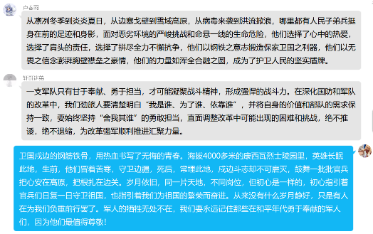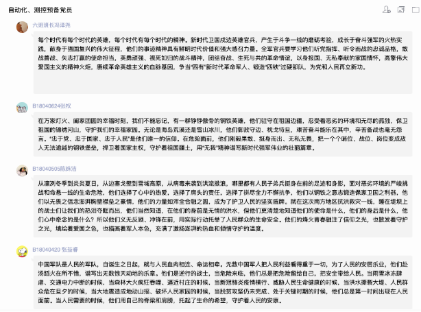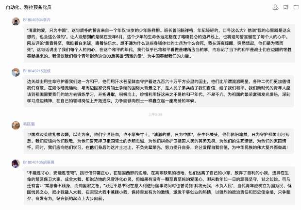 “清澈的爱,只为中国。”在祖国的边疆,英雄官兵用铮铮誓言和实际行动诠释着对祖国最纯洁的爱。家为人民不怕牺牲、勇于奉献的精神,学习他们的责任与担当,把个人与祖国相联系,把个人梦想融入国家的复兴之梦。2020级各支部,积极组织广大团员学习观看戍边英雄事迹,谈体会、写感悟,在线上平台积极展开讨论交流。“祖国的边疆有一群可爱的人在时刻用生命保护我们,作为当代大学生,我要学好知识、努力奋斗,致敬中国这些边防战士,他们是最可爱的人。”B200408班夏雨轩说。