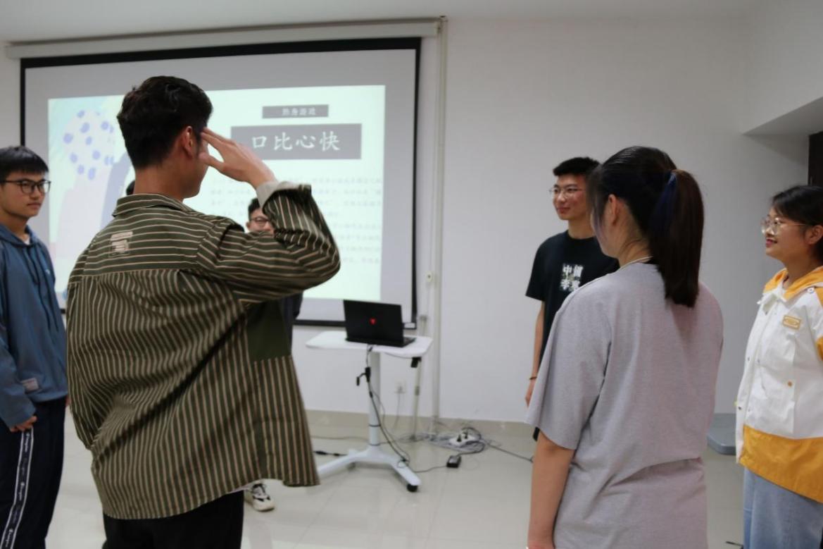 欢乐的小游戏必不可少,“口比心快”这一环节中,每组派两名代表前去比赛,游戏规则是1号小组代表说出A动作,并且做一个与说的动作不相同的B动作,紧接着2号小组代表需做出第一位同学说的A动作并说一个与说的动作不相同的C动作,以此类推。如比拼过程中间小组代表出现明显错误,则视其游戏失败,需自动退出,最终决出优胜者。这个游戏锻炼了大家的反应能力,而且拉近了大家之间的距离,并为心理委员举办班级活动提供了良好借鉴。