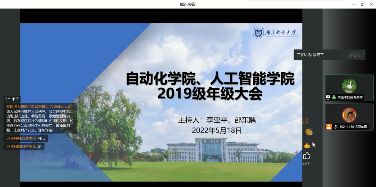 为做好常态化新冠肺炎疫情防控工作,提升学生法律安全意识,进一步帮助学生明确毕业规划,助力学生成长成才,5月18日下午,麻豆av 、人工智能学院通过线上线下相结合的模式开展了2019级学生年级大会。麻豆av 2019级学生骨干线下参会,其余学生线上参会。本次会议由2019级辅导员李亚平和邵东隅老师主持,包含了疫情防控法律知识宣传、防火防灾警示教育以及毕业意向调研等内容。