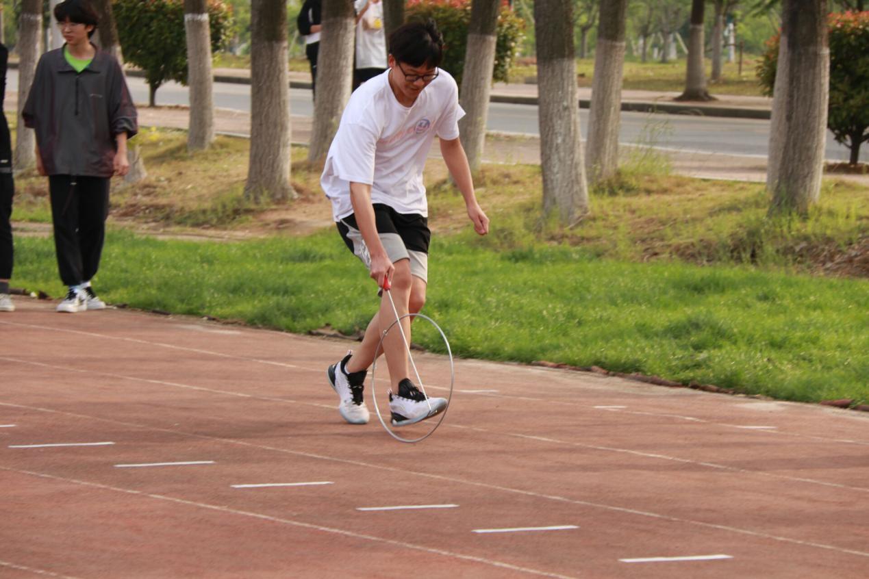 第一个游戏——滚铁环。参赛选手一只手扶铁环,一只手扶铁钩,裁判喊计时开始,选手扶铁环的手脱离铁环,铁钩推着铁环向前滚动,前进运送到终点,计时结束。同学们蓄势待发,随着裁判员一声令下,同学们如离弦之箭,迅速地将铁环向前推动,并努力送达终点。这个游戏锻炼了同学们的灵活性和平稳性,大家不断改进方法,力争能够最稳最快完成游戏。