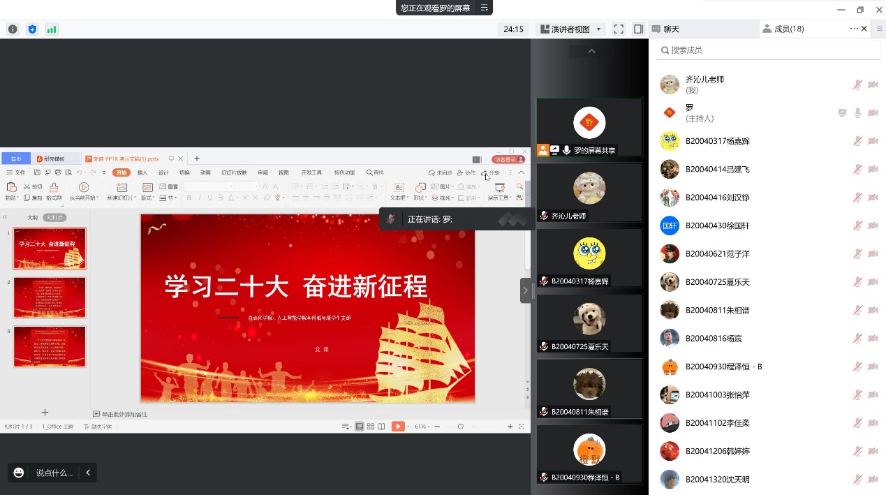 随后,罗帅老师向同学们普及了党的二十大的历史背景和重要意义,深刻解读新时代十年的伟大变革和历史性飞跃。以新时代新征程下中国共产党的中心任务为出发点,从新发展格局、科教兴国、人民民主、依法治国、绿色发展等多个维度解读党的二十大报告重点内容,带领同学们学习党的二十大报告中的新表述、新概括和新论断,同时 号召麻豆av 学子为党和国家的事业发展贡献青春力量。