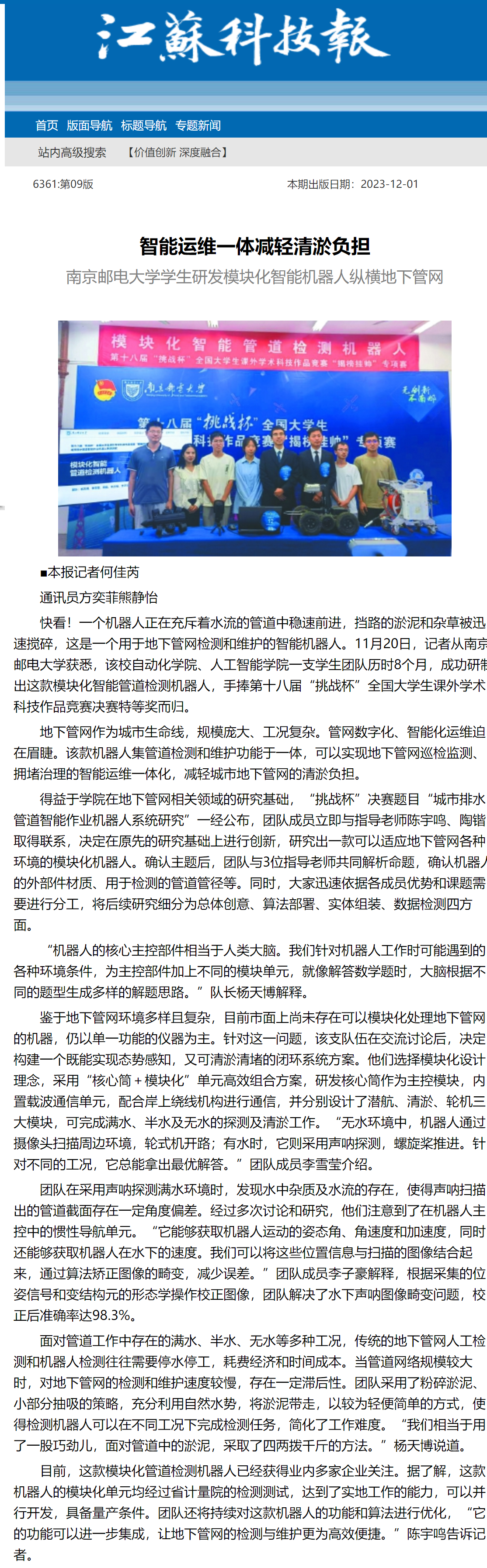【江苏科技报】智能运维一体减轻清淤负担麻豆av 学生研发模块化智能机器人纵横地下管网