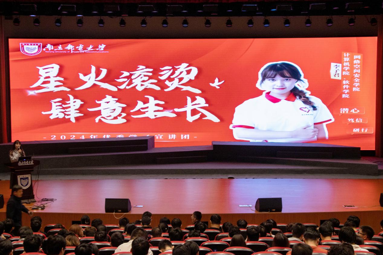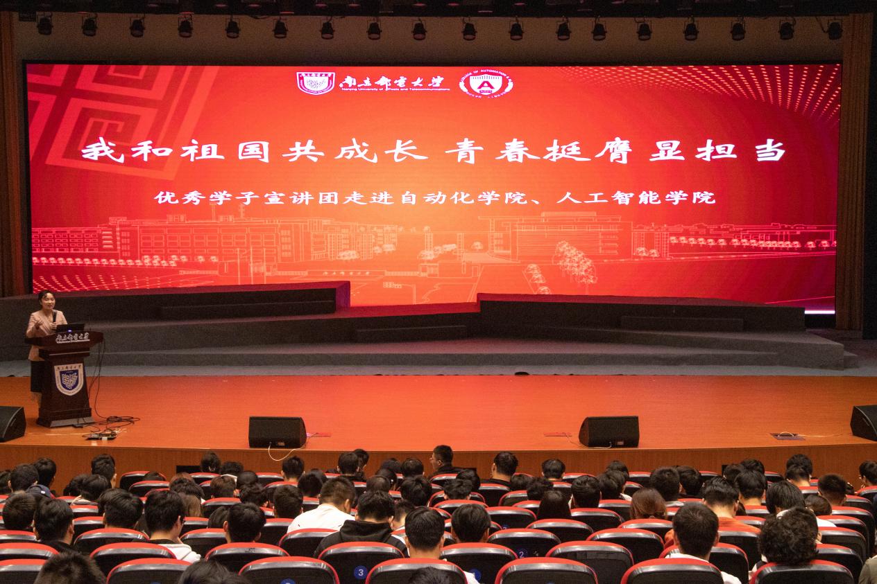 为持续推进“学在南邮”优良学风建设工作,确保学风建设工作提质增效。充分发挥各类先进典型在学生成长中的示范引领作用,打造“用身边人讲身边事,用身边事影响身边人”的朋辈教育理念,传递“向榜样学习、与榜样同行”的精神内核。10月31日晚,校第七届优秀学子宣讲团走进麻豆av 、人工智能学院,500余名师生于青春剧场内共上一堂信仰公开课、梦想公开课、思政公开课。学院党委副书记、副院长孙委委,辅导员桑学峰、齐沁儿出席。活动由齐沁儿老师主持。